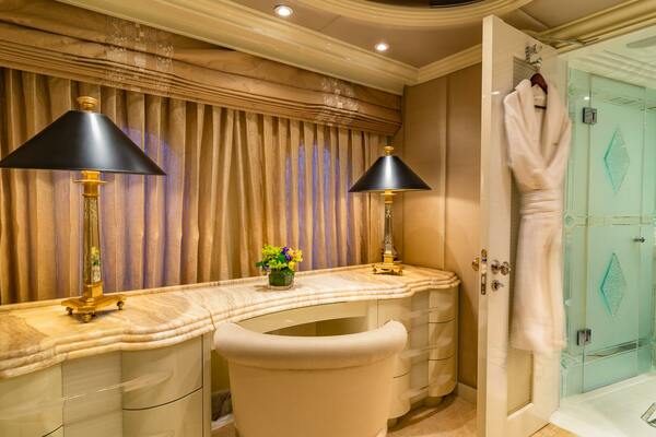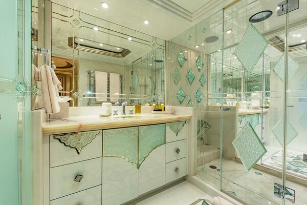 - Refined interior with high-gloss wood, etched glass details, and custom furnishings
